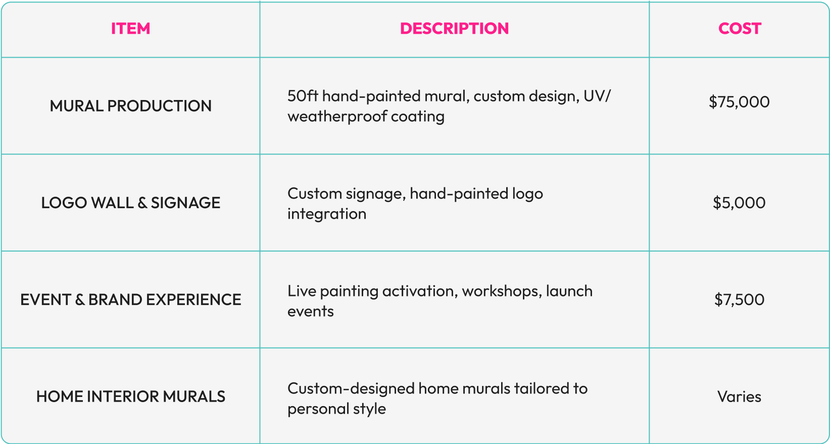 Murals define spaces, making them visually memorable and deeply connected to the community. Investing in a hand-painted mural means investing in a timeless brand asset that draws foot traffic and enhances your business's or home's aesthetic and visibility.