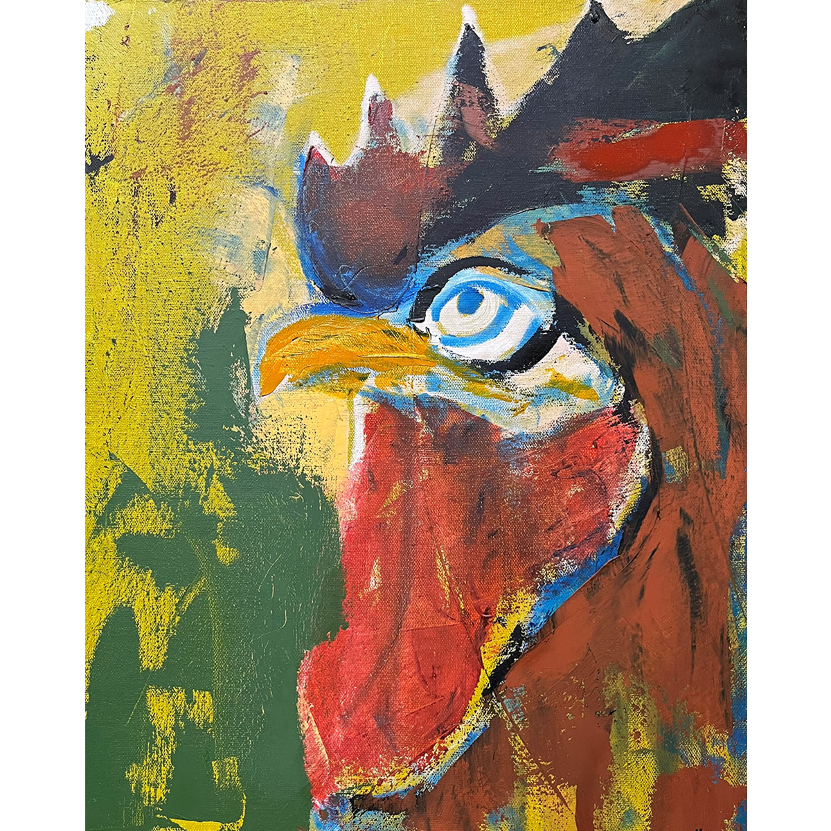 In "Big Papi," Perez masterfully captures the very essence of the rooster, immortalizing its commanding presence and awe-inspiring charisma. The dynamic strokes and a vivid palette infuse the canvas with a pulsating energy, amplifying the rooster's innate dynamism.