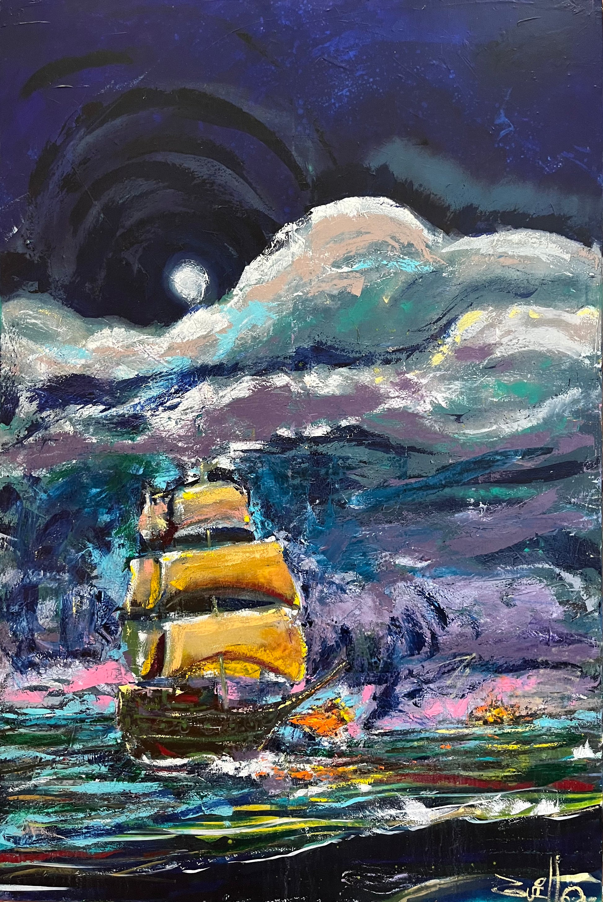 "Captain Grey Beard" is a dramatic and awe-inspiring painting that depicts a fleet of battleships in action. The canvas is filled with intricate and lifelike details, giving the viewer a sense of the scale and power of these mighty vessels. The ships are depicted in the midst of a battle, with plumes of smoke rising from their decks and the roar of cannon fire echoing through the air. The water is choppy and turbulent, adding to the sense of chaos and intensity. The colors used in the painting are deep and rich, with shades of grey and blue representing the ships and the water. The overall effect is one of strength and courage, as if the viewer is right there with the captains and crews, facing the dangers of war. The title, "Captain Grey Beard," perfectly captures the sense of authority and experience conveyed by the painting, as well as the rugged and determined spirit of the men who sailed these ships. This piece would be a great addition to any collection, adding a touch of history and drama to any space.