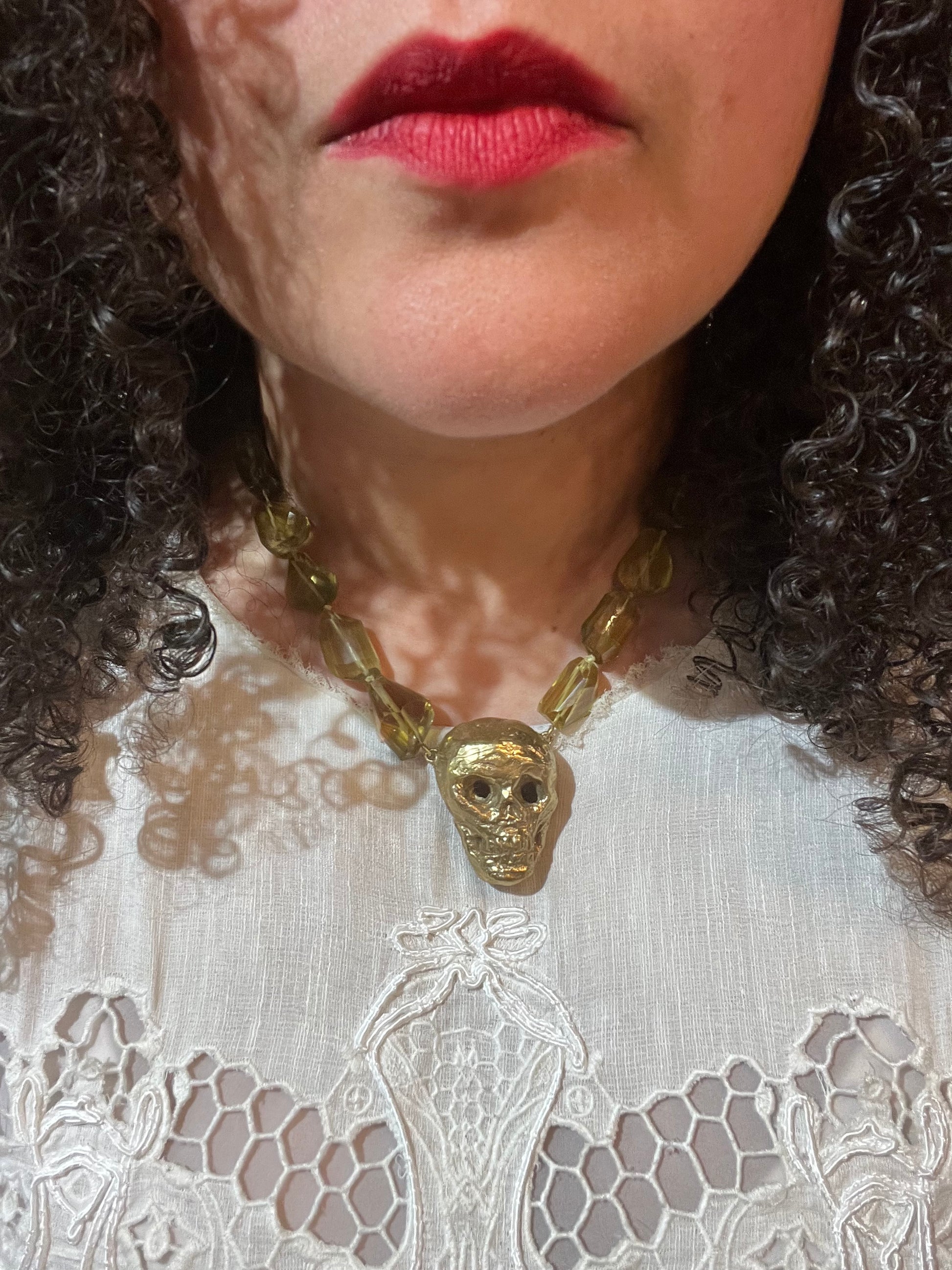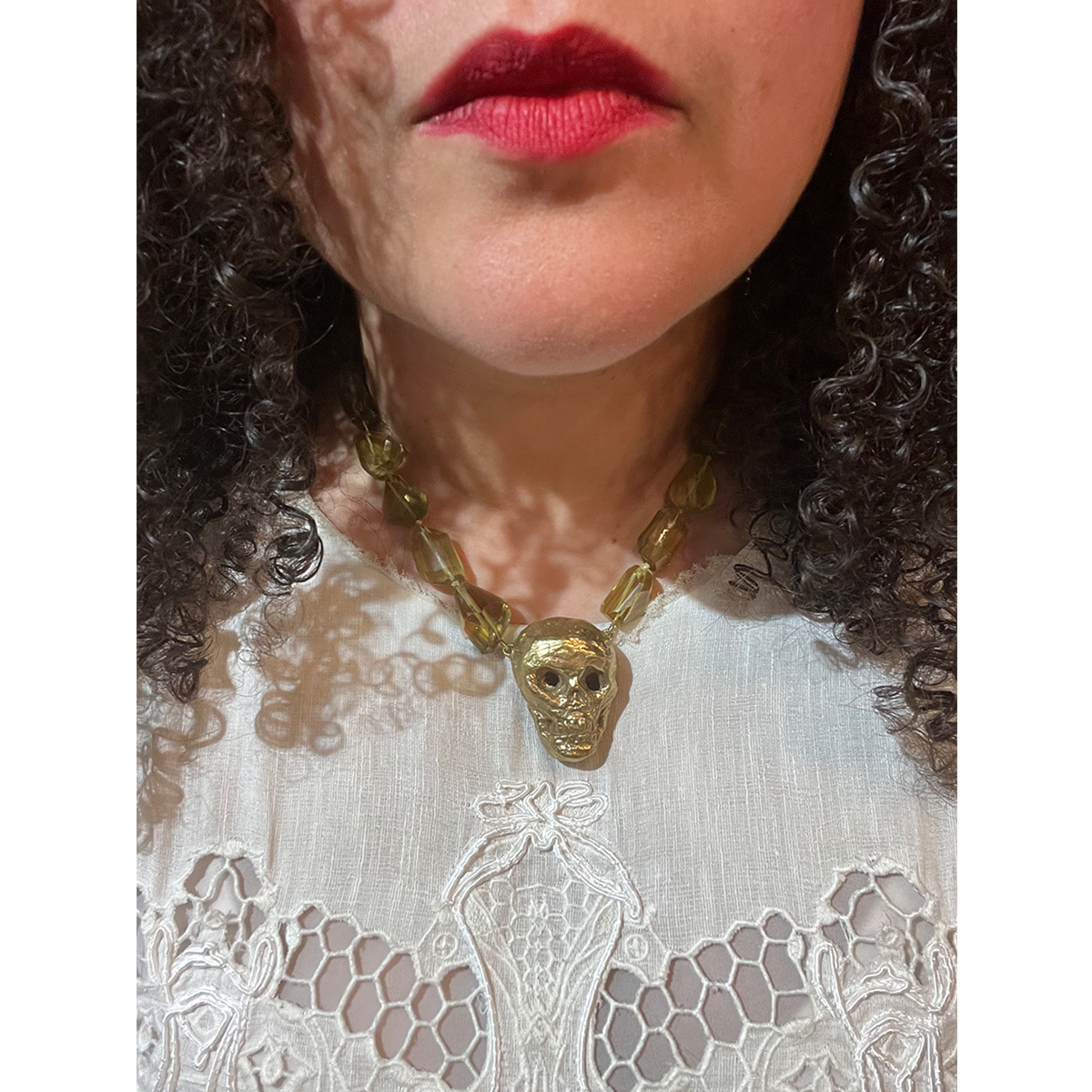 The "Citrus Sentinel" necklace is a testament to individuality, blending the robust presence of the bronze skull with the radiant allure of lemon quartz. This unique fusion creates a striking statement piece that resonates with those who seek to redefine conventional beauty.