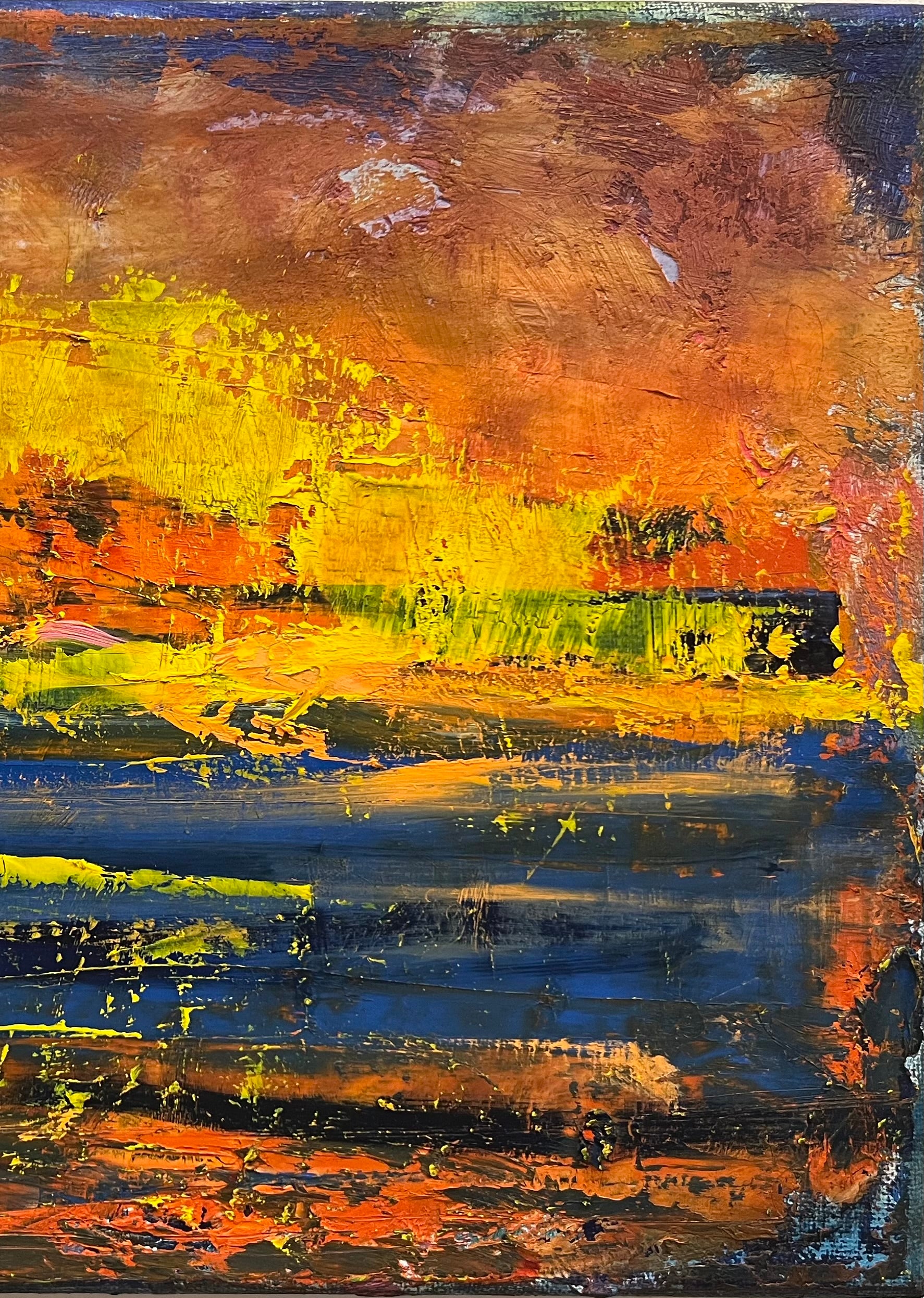 A luminous study in motion and light, Fiery Horizon captures the fleeting moment where sun and sea blur into one. Dominated by tones of orange, yellow, blue, and violet, this original oil painting by Guillo Perez III radiates both calm and energy — an exploration of how warmth and stillness coexist at day’s end.