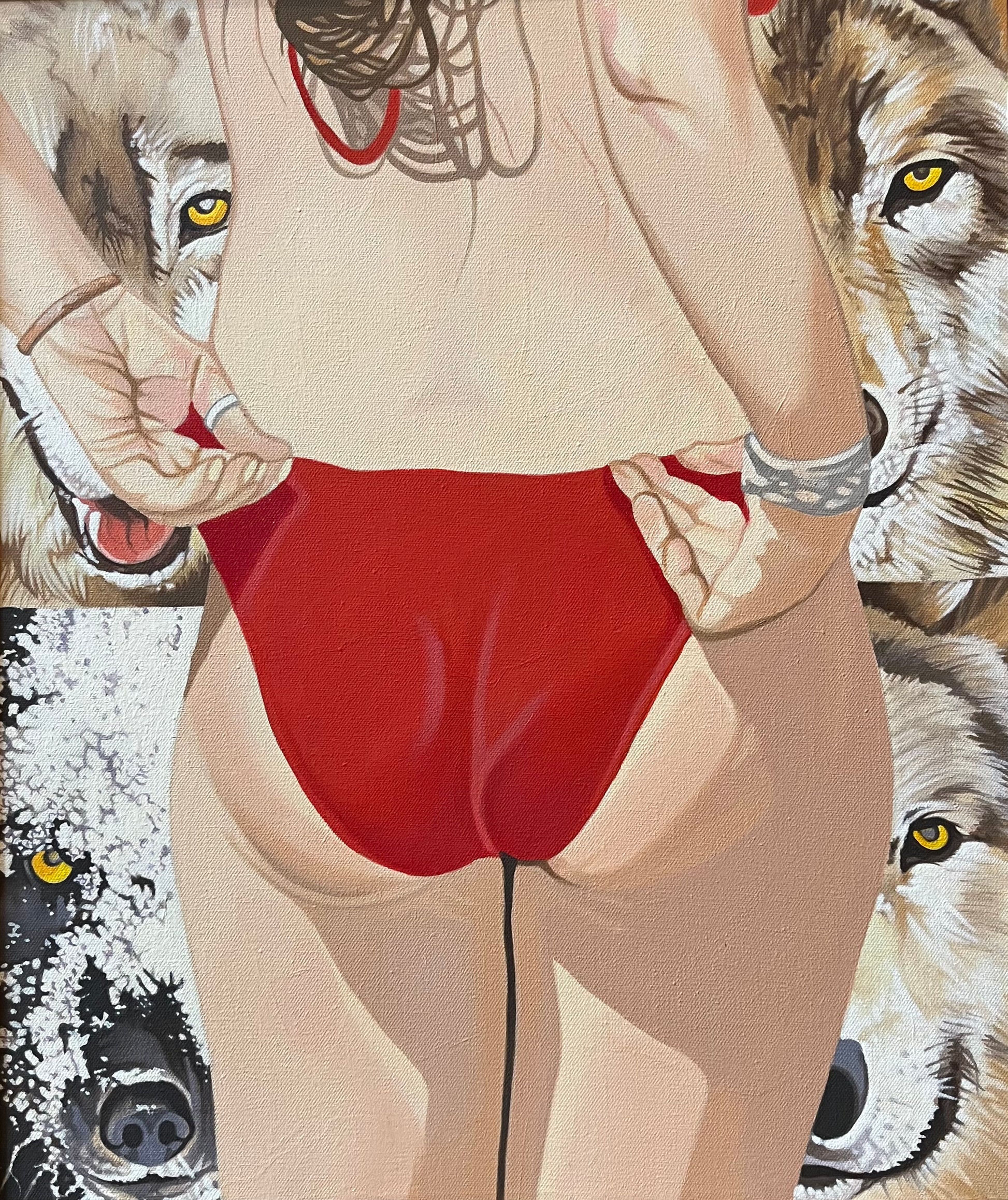 Explore "Four Eyes," a thought-provoking artwork that encourages introspection about perception and symbolism. Initially, the image portrays a woman adjusting her red bikini. However, it delves deeper by juxtaposing four distinct frames of wolves in the background.