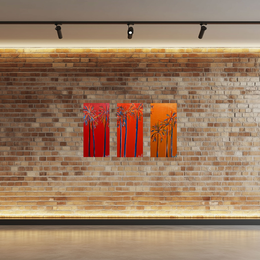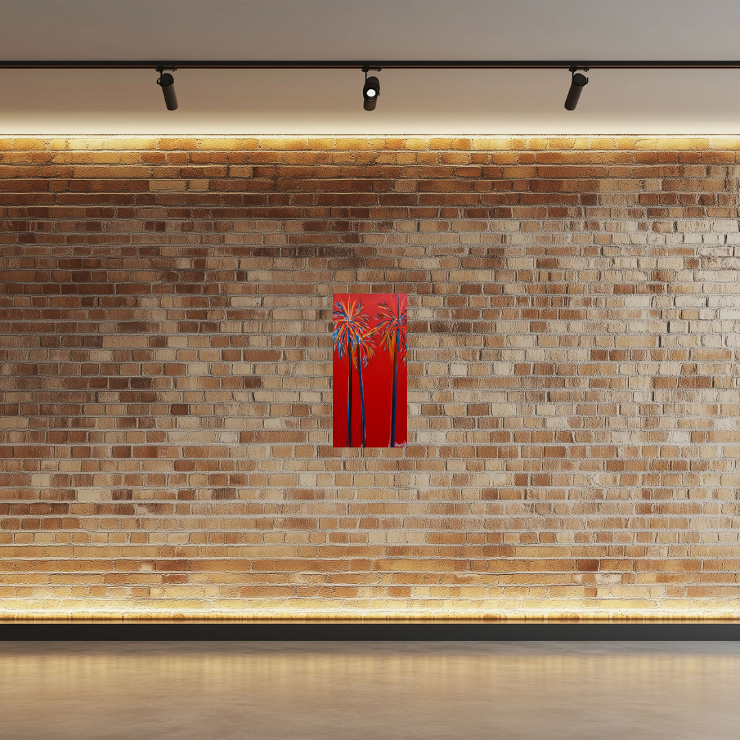 Palm Trees I by Guillo Pérez III is a bold oil on canvas that radiates the energy of the tropics. Set against a vibrant red background, tall palms rise in expressive strokes of cobalt blue and gold, evoking both motion and warmth.
