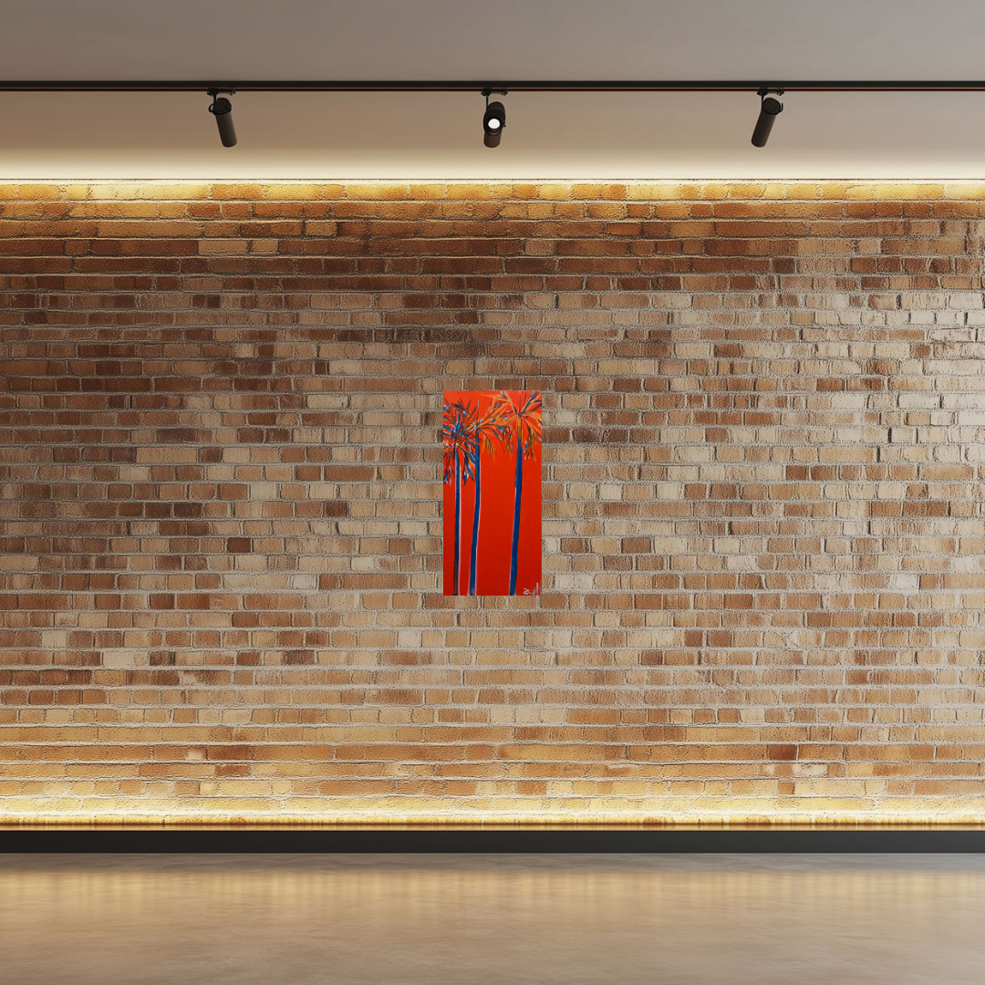 Palm Trees II by Guillo Pérez III glows with the heat of a Caribbean afternoon. Painted in vivid red-orange with tall, elegant palms outlined in blue and red, this oil on canvas captures motion, sunlight, and spirit in pure color.