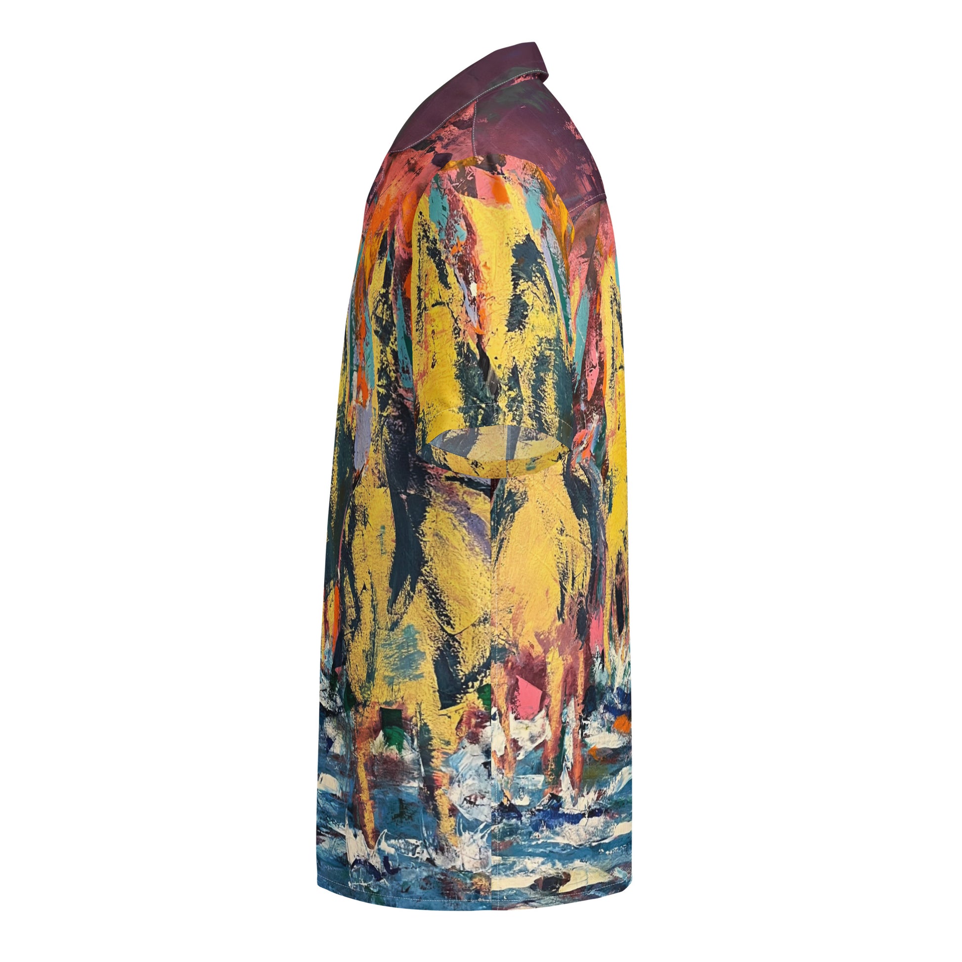 “Ride With Me” offers an invitation into motion, captured mid-stroke by Guillo Pérez III. Painted with speed and emotion, it features two abstract riders cutting through color and chaos. The shirt’s composition suggests freedom, a rush, a moment shared, raw and unstaged. Equal parts expressive and elusive, it’s a conversation piece that rides with you.