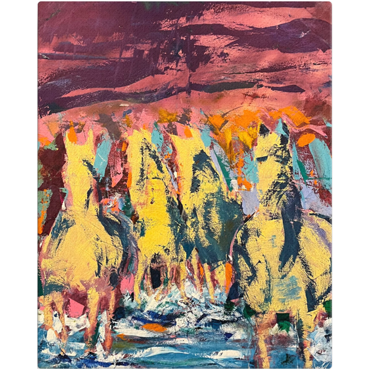 "Ride with Me" is a stunning painting that captures the beauty and grace of horses running through water. The canvas is filled with rich, lifelike details and a breathtaking sense of movement. The horses are depicted mid-gallop, their hooves splashing through the shallow water as they run. The ripples and waves created by their movement add to the sense of action and energy in the painting. The colors are bold and vibrant, with shades of blue and green representing the water and the horses' coats shining in the sunlight. The overall effect is one of freedom and wildness, as if the viewer is right there with the horses, feeling the rush of the wind and the cool spray of the water. The title, "Ride with Me," perfectly captures the feeling of adventure and excitement that is conveyed through the use of color, composition, and detail in the painting. This piece would be a wonderful addition to any home or office, bringing a sense of wonder and joy to any space.