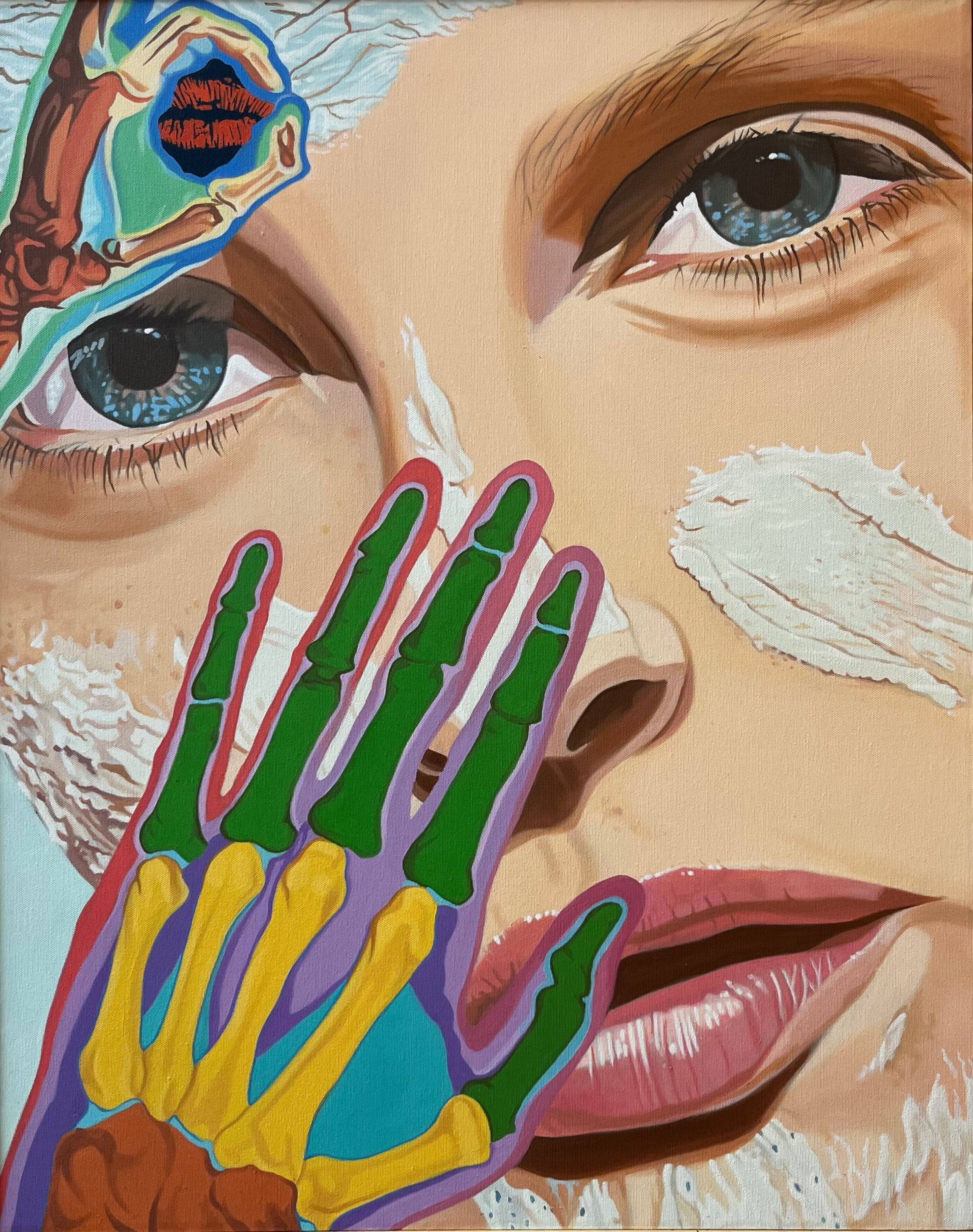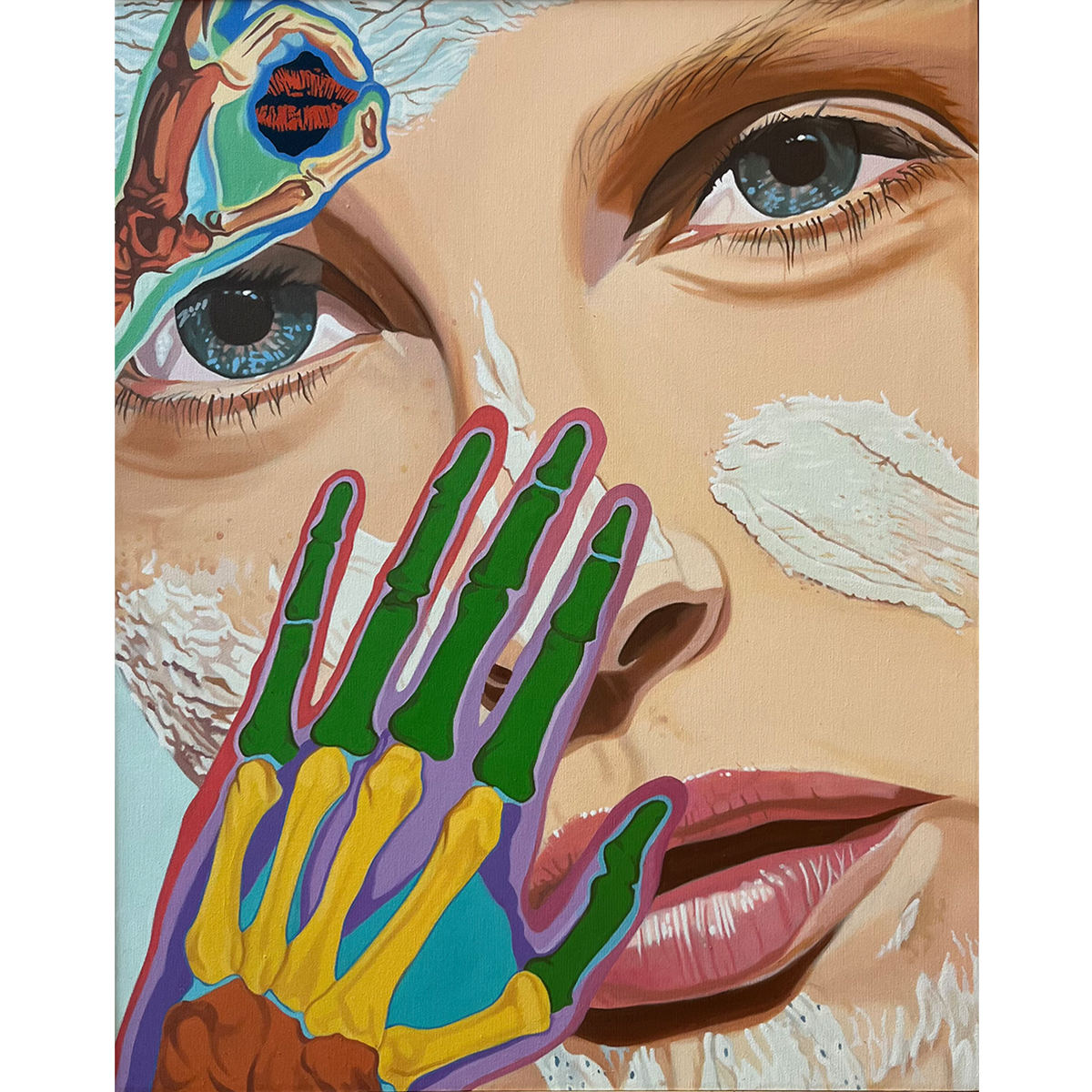 At the heart of the painting, the woman's face commands attention with its delicate features, rendered with exceptional precision. One hand gracefully cradles the side of her face, conveying a sense of vulnerability and introspection. Through this gesture, the viewer glimpses the hidden layers of human anatomy—the skeletal structure and muscular system. Vivid hues and contrasting colors breathe life into these concealed elements, creating a striking contrast against the woman's serene countenance.
