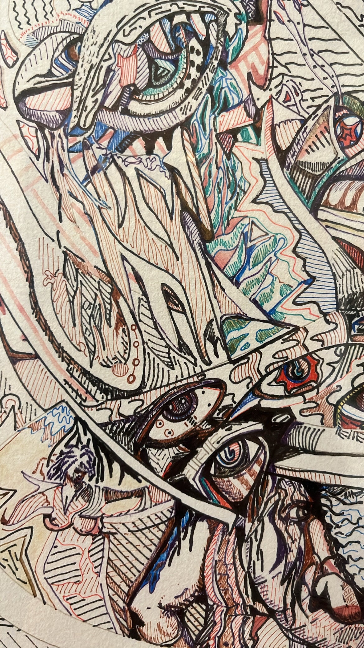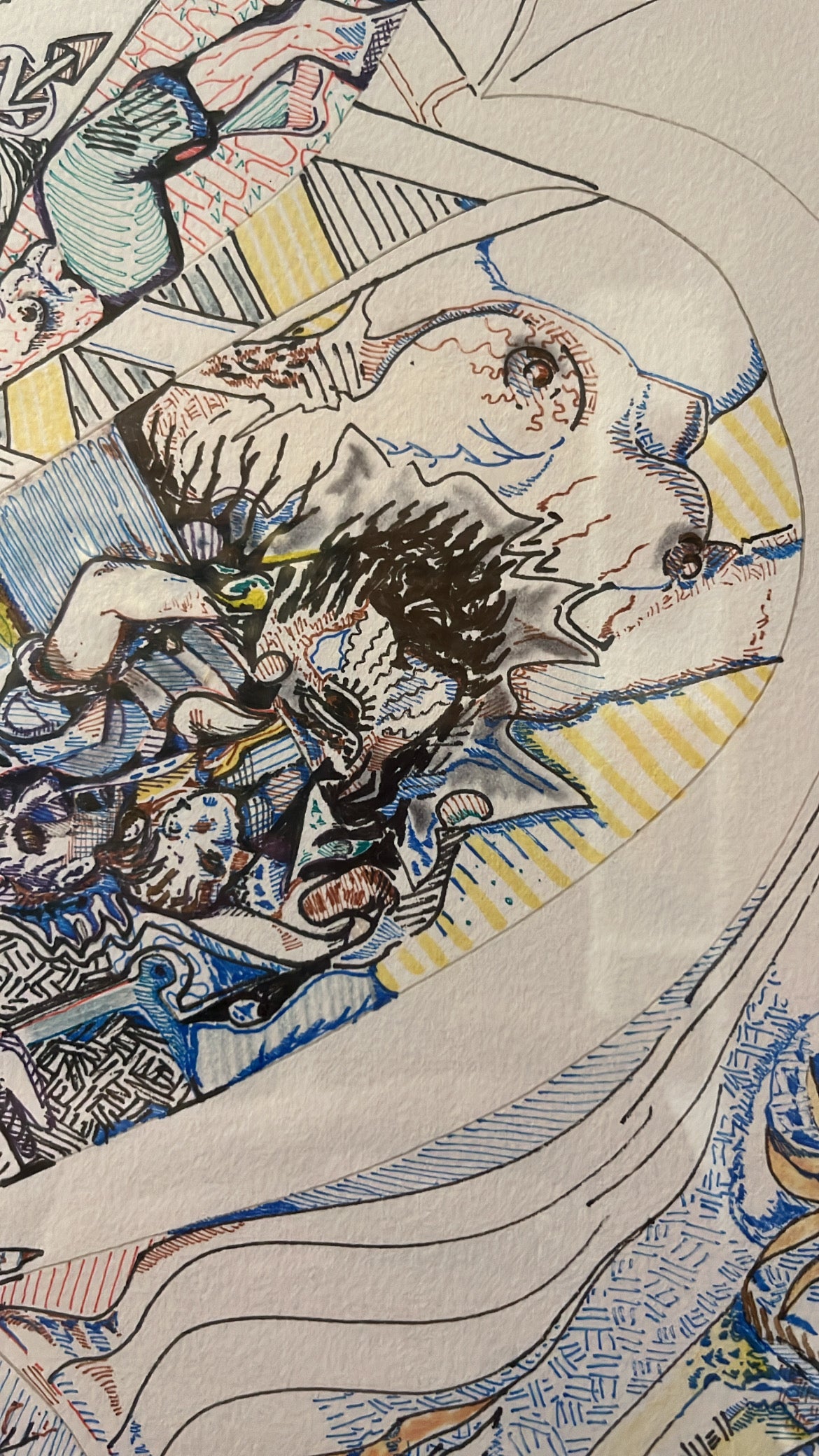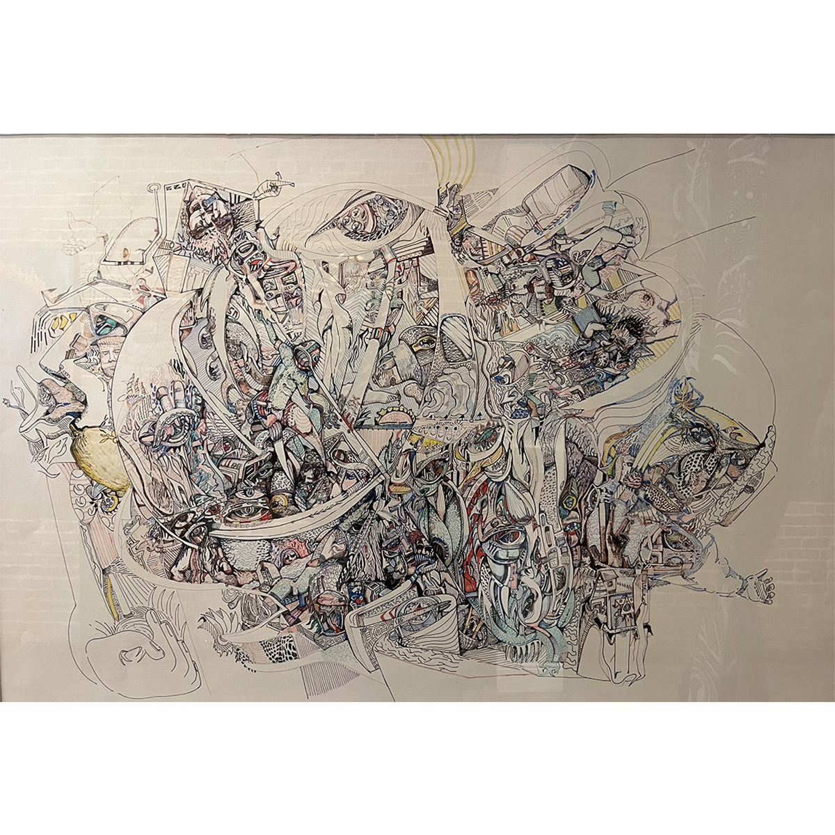 Greg Latch's 'The Garden of Earthly Delights/Three Months Gone By' is a mesmerizing ink on paper creation that transports viewers into a world where imagination reigns supreme. With meticulous attention to detail and a masterful command of ink, Latch invites us to wander through landscapes where reality and fantasy intertwine in breathtaking harmony.
