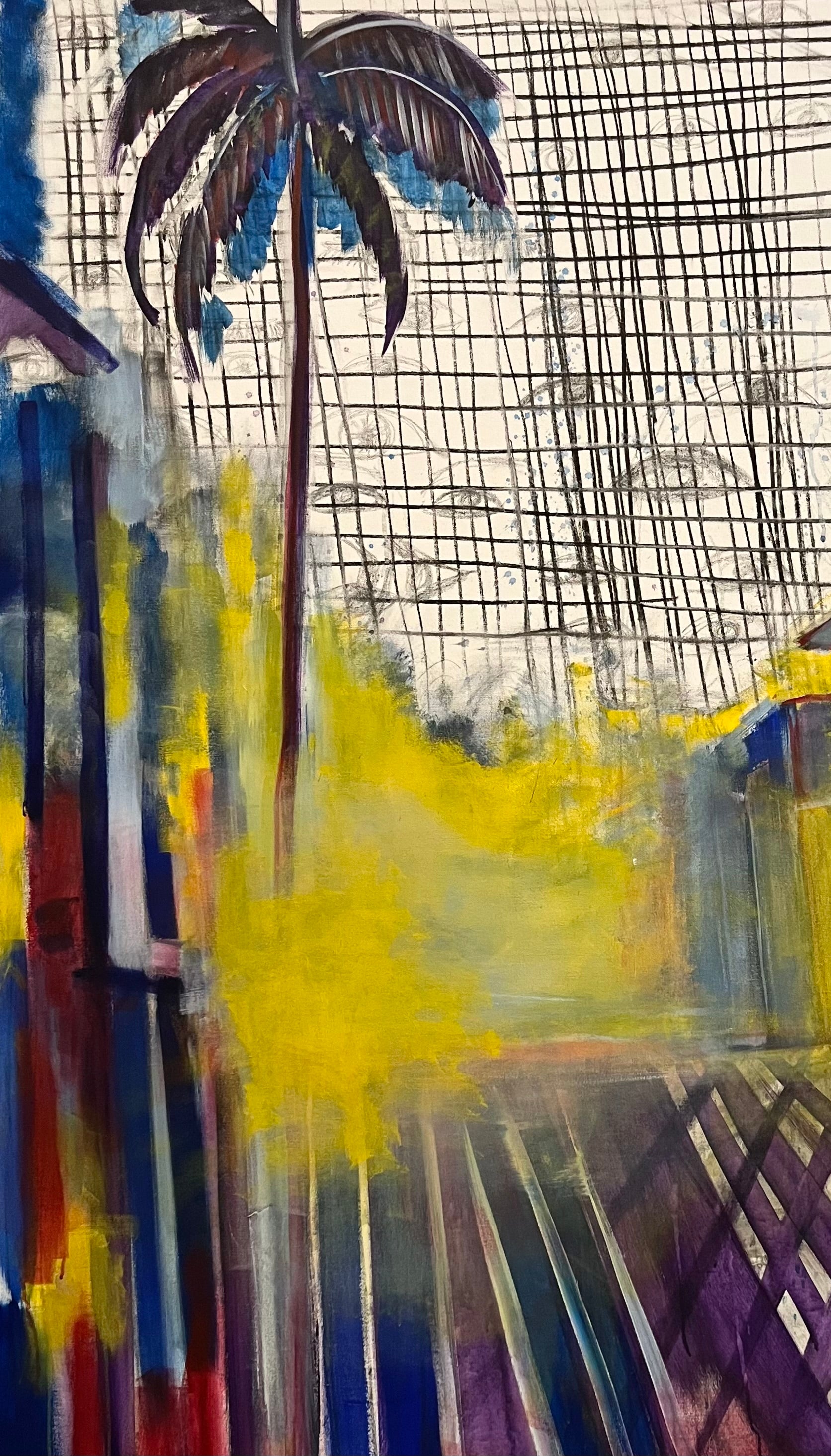 This piece is a stunning blend of expressionist boldness and the unmistakable character of Ybor City. The iconic tall palm trees and unique architecture stand out, while the interplay of vibrant yellow hues and deep purples and blues evokes both the sunlight and shadow of this historic neighborhood. The black grid-like lines in the background hint at the industrial history and structure of the city, perhaps paying homage to its cigar factory roots.