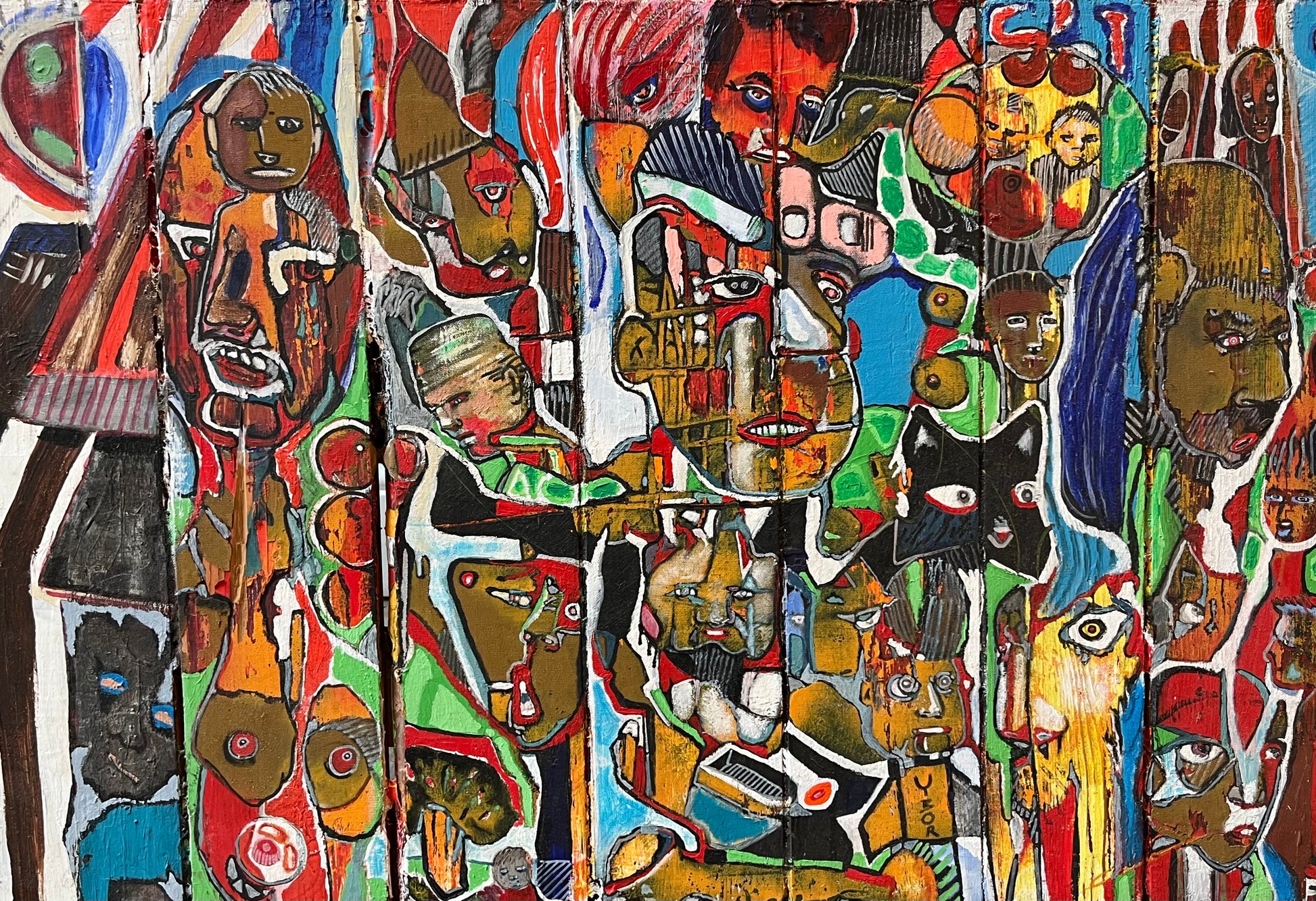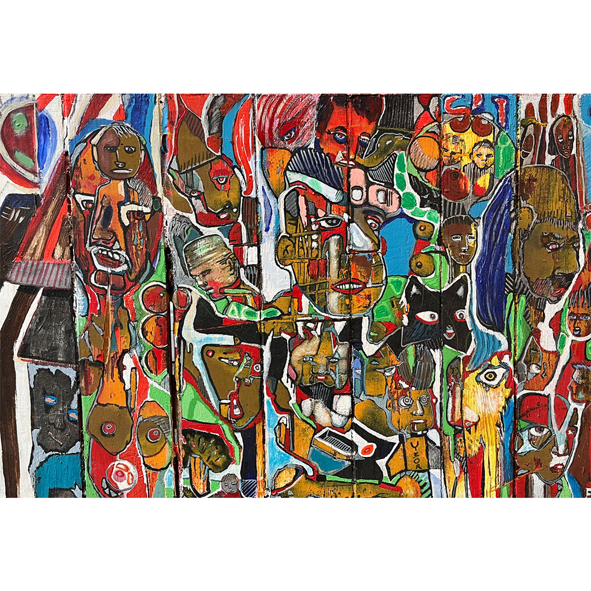 In this acrylic masterpiece on wood, Latch expertly captures the essence of his time as an artist and resident in Ybor City, Tampa, FL. The artwork features a captivating assortment of characters, ranging from feline companions to intriguing individuals and even body parts.